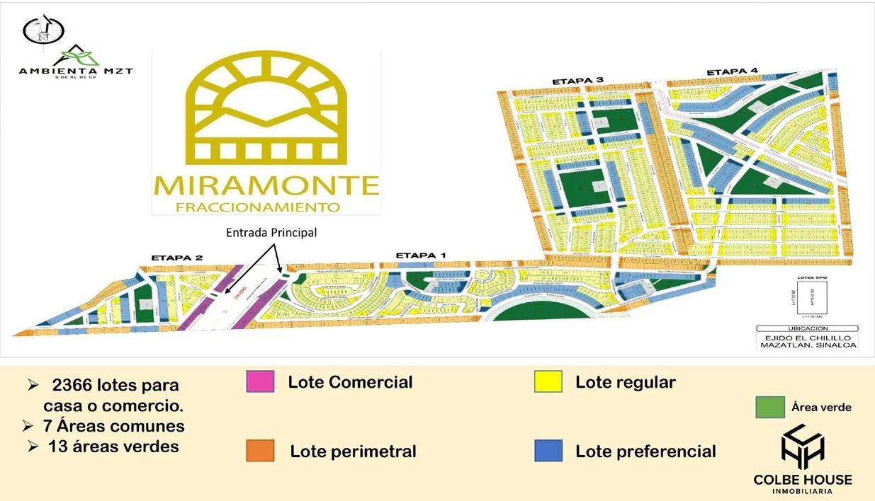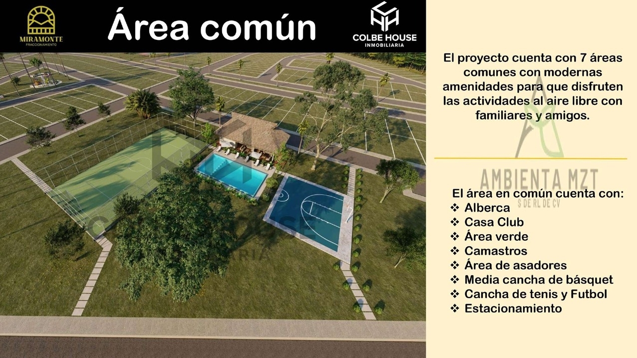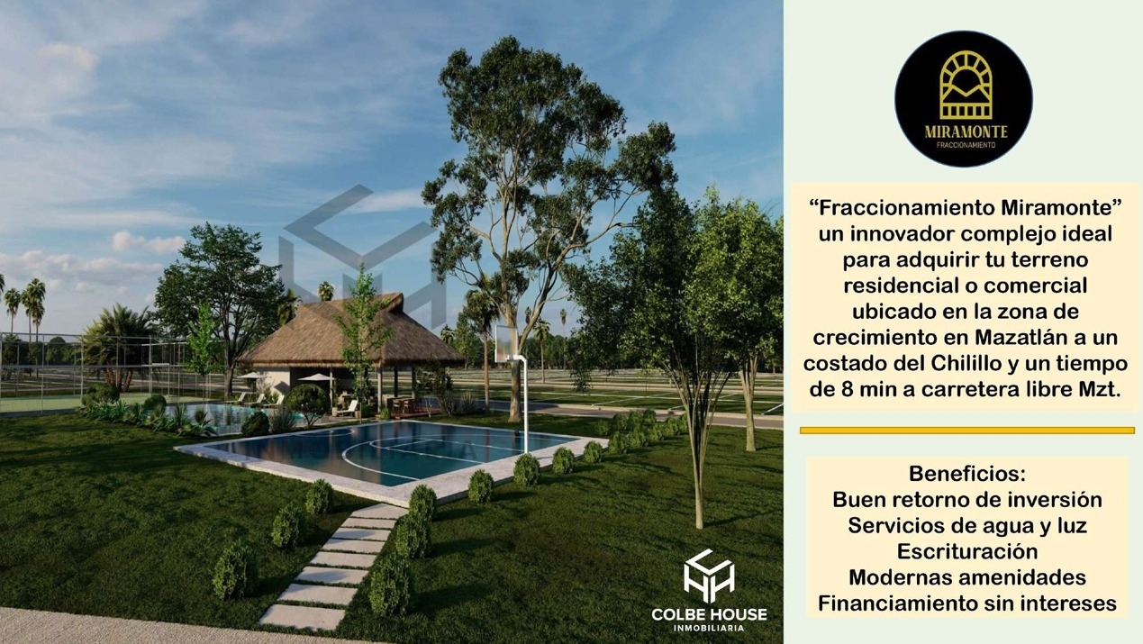 SE VENDE TERRENO MIRAMONTE FRACCIONAMIENTO, UBICADO EN LA ZONA DE MAYOR CRECIMIENTO DE MAZATLÁN, A UN COSTADO DE EL CHILILLO, LOTE DE 7M FRENTE X 17M FONDO, SERVICIO DE AGUA LUZ, CUENTA CON ÁREAS COMUN, ALBERCA, CASA CLUB, ÁREAS VERDES, CAMASTROS, ÁREA DE ASADORES, MEDIA CANCHA DE BÁSQUET, CANCHA TENIS Y FUTBOL, ESTACIONAMIENTO.