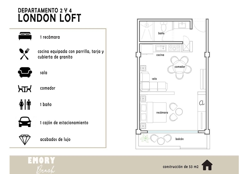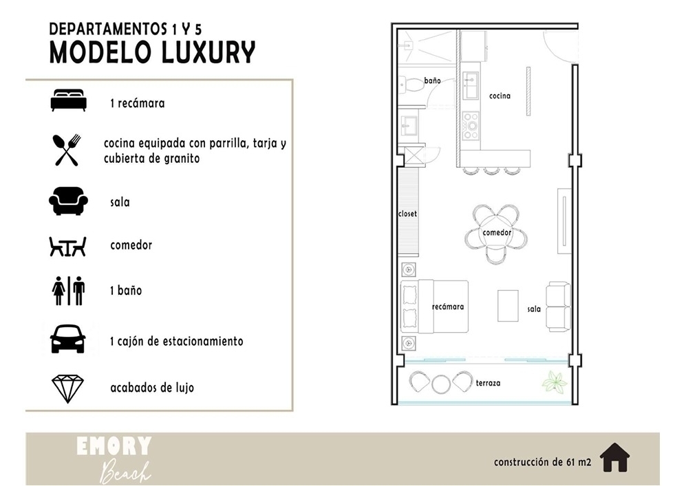 * 1 RECAMARA, COCINA EQUIPADA CON PARRILLA, TARJA Y CUBIERTA DE GRANITO, SALA, COMEDOR, BAÑO, 1 CAJÓN ESTACIONAMIENTO, ACABADOS DE LUJO.