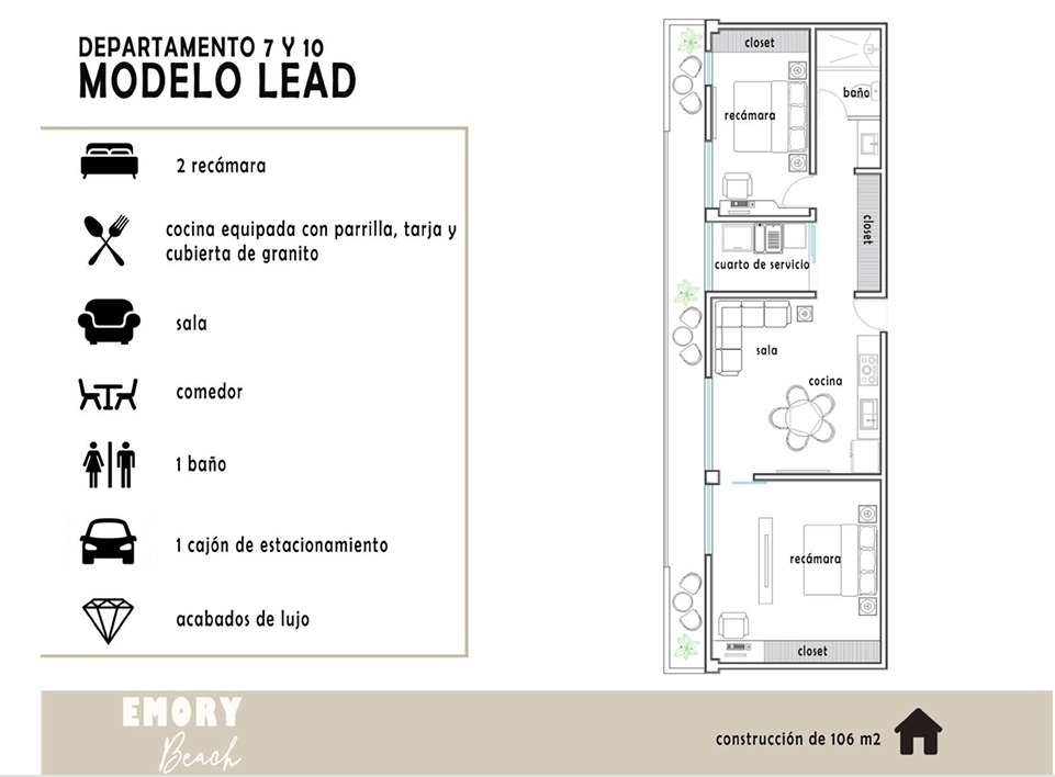 * 2 RECAMARAS, COCINA EQUIPADA, CON PARRILLA, TARJA, Y CUBIERTA GRANITO, SALA, COMEDOR, BAÑO, 1 CAJÓN ESTACIONAMIENTO, ACABADOS DE LUJO.
