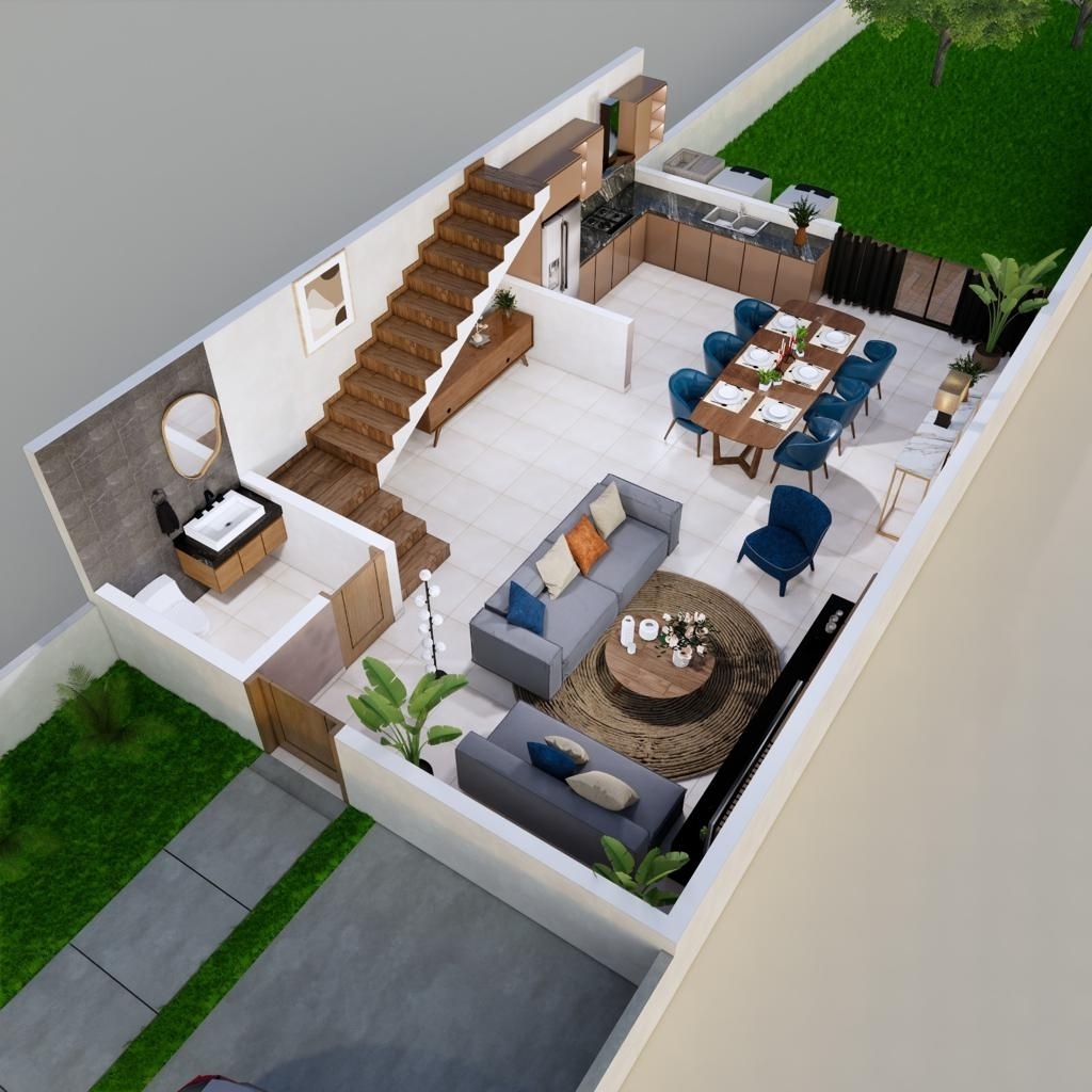 - PLANTA BAJA CUENTA CON SALA, COMEDOR, COCINA DE CONCRETO CON CUBIERTA DE PORCELANATO (NO INCLUYE MADERA) Y MEDIO BAÑO.